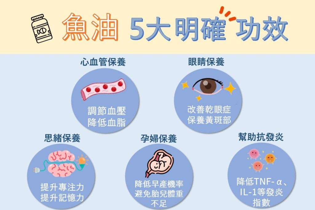 - 魚油5大功效:心血管保養、眼睛保養、腦部保養、孕婦保養、抗發炎