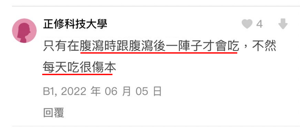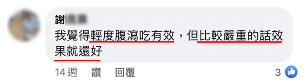 ⭐ 如同前面實驗結果提到的,妙利散主要是對於『抗生素相關的腹瀉』幫助比較大,事實上在臉書&Dcard的網友討論中,也得到了差不多的評價,分別如下: