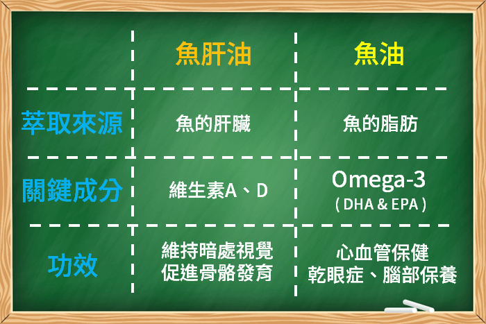 魚肝油萃取自魚類的肝臟,主要的關鍵成分是維生素A、維生素D,而魚油則是萃取自魚類的脂肪,主要關鍵成分為Omega-3 (DHA&EPA),兩者的萃取來源、關鍵成分、功效大不相同